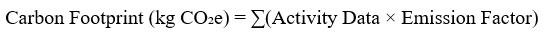 Here, activity data represent the quantity of resources consumed, such as electricity in kilowatt-hours (kWh), fuel in litres, food in kilograms, waste in kilograms, and water in litres. Emission factors correspond to the standard CO2 emissions associated with each unit of consumption. These factors were sourced from reputable institutions, including the Intergovernmental Panel on Climate Change10, the Central Electricity Authority 4, the Food and Agriculture Organization 7, and the World Resources Institute 33.