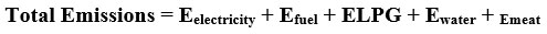 Where each term corresponds to emissions from respective sources, such as electricity, fuel, LPG, water, and meat consumption. Data on electricity usage was captured in kilowatt-hours, LPG in kilograms, and water and meat consumption in litres and kilograms, respectively.