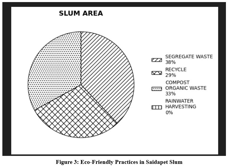 The pie chart in Figure 3 depicts the distribution of eco-friendly practices adopted by households in the Saidapet Slum. The data reveal that waste segregation is the most commonly practiced method, with 38% of households engaging in the separation of waste. This reflects a moderate level of awareness regarding basic waste management, even in economically constrained environments.