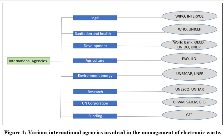 The process of management of electronic waste was strengthened by adopting methods like EPR in the year 2012 with an amendment done in 2016. This is an environmental approach that extends the responsibility of the manufacturer to various segments of the product lifecycle most particularly the take-back policy. A recent review by Patil et al.,14 reported that every country has different legislations governing the EPR system. Apart from this, there are various active agencies involved in the efficient management of electronic waste. These bodies work on the international platform may be individually or in collaboration with government agencies to tackle the issue related to the generation, recycling, and efficient management of electronic waste. Some of the important bodies working at an international level are the World Bank, UNICEF, WHO, UNESCO, UNITAR, UNIDO, UNDP, OECD, INTERPOL, WIPO, etc. They deal with different areas like legal responsibility, health, sanitation, Agriculture, development, training research, and culture (Figure 1).