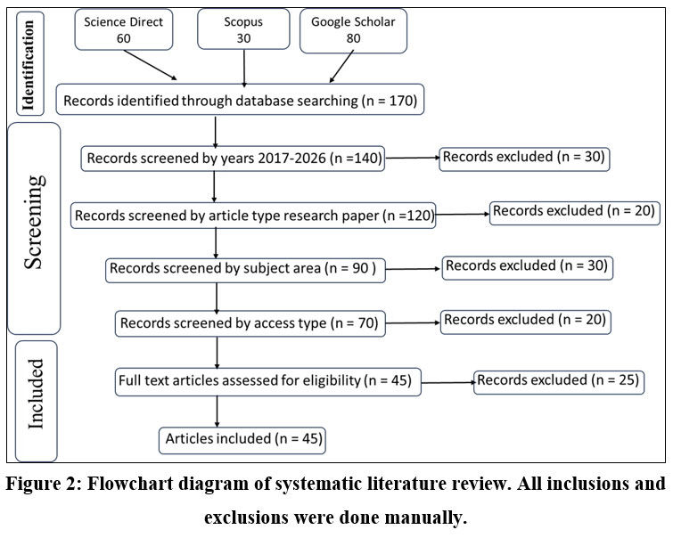 An extensive systematic literature survey methodology, leading to journal searches according to the Preferred Reporting Items for Systematic Reviews and Meta Analyses (PRISMA) flow guidelines. PRISMA guidelines are a well-known standard for assessing systematic reviews and meta-analyses. Database search has been carried out to assemble peer-reviewed articles, mainly emphasize on the work “nanobiofertilizer in the field of agriculture” that were published between 2017 and 2026. Data were retrieved from the articles available in Scopus, Google Scholar and Science Direct using keywords such as ‘nanobiofertilizer’, ‘biofertilizer’, ‘chemical fertilizer’, and ‘agriculture’. The selection process followed PRISMA guidelines, as represented in Figure 2.