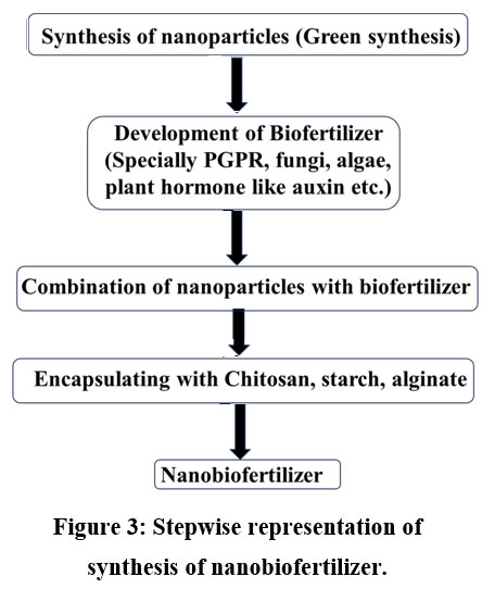 Metal nanoparticles so far synthesized combines with plant growth promoting Rhizobacteria (PGPR) like Azotobacter, Azospirillum, Pseudomonas sp., Bacillus sp., Mycorrhizal fungi, Blue-green algae, and then encapsulated with chitosan, starch, alginate solution to form nanobiofertilizer. Systematic stepwise synthesis of nanobiofertilizer has been depicted in Figure 3.