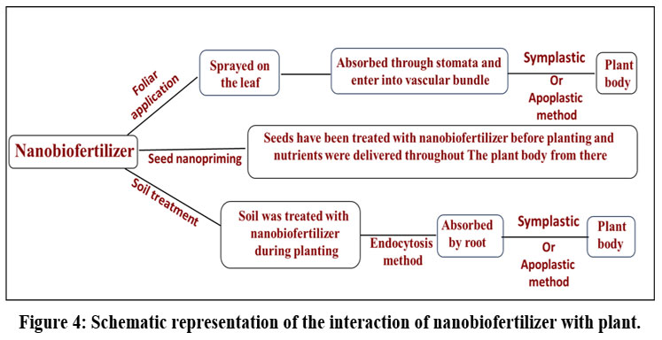 The suitable method of application of nanobiofertilizer has played a crucial role in the growth of plants. The choice depends on the soil quality, weather type and nutrient accessibility. Concerning these facts, suitable selection of the mode of application of nanobiofertilizer makes it more useful in modern agriculture. Three primary methods30 that have been employed for the application of nano-biofertilizers are foliar application, seed nanopriming and soil treatment. A foliar application31 involves the spraying of a nanobiofertilizer onto the leaf's surface, leading to its direct absorption through stomata, and further penetrate into vascular bundles and spread throughout the plant body following symplastic and apoplastic pathways. Cuticle on the surface area of the leaf hinders the absorption of nutrients through stomata which has further overcome by the formation of nanobiofertilizer. The treatment of seeds with nanobiofertilizer before planting is the major concern of the seed priming method.32 This mode of application increases the rate of germination of the seed along with specific delivery of nutrients in minimum concentration to avoid its toxic effect on plants. The application of nanobiofertilizer to the soil in the required amount during planting is included in the soil treatment mode32 of application. The applied nutrients have been absorbed by the root of the plants through endocytosis method and then carried out throughout the whole plant body by symplastic and apoplastic pathways. This method has several beneficial aspects, like application feasibility, controlled release of nutrients, thereby minimizing the loss of nutrients and improving plant growth. Some methods like root dipping, main field application etc. have also been applied by farmers to get a better effect from it. A systematic representation of the mode of interaction of the nanobiofertilizer with the target plants has been shown in Figure 4.