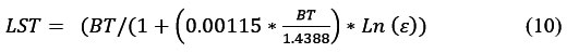 Where BT is the brightness temperature in Kelvin, E is the Land surface emissivity.