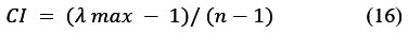 in which the consistency Index (CI) was calculated using Eq. 16, where RI is the consistency index of a random square matrix of the same order.