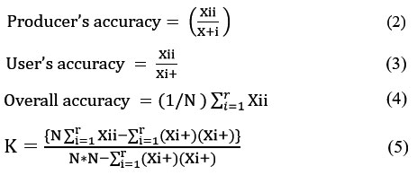 Three different error metrics were used in this study to assess the accuracy of the LU/LC classification. One of the important measures of accuracy assessment is the Cohen31 The Kappa index (K) assesses the concordance between observed and expected data. In addition, the post classification accuracy was examined using measures, such as the producer’s accuracy, user’s accuracy, and overall accuracy, which is calculated using the given equations.