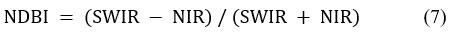 The NDBI is a spectral index commonly used to evaluate the impervious surface or built-up area in a region.33 Its derivation uses the NIR and short-wave infrared (SWIR), and the index ranges from +1.0 to -1.0 (Eq. 7).