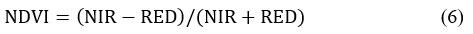 We used the spectral indices, viz., Normalized Difference Vegetation Index (NDVI) and Normalized Difference Built-up Index (NDBI), to derive the relationship between LST and LU/LC of the region. The derivation of NDVI (Eq. 6) utilizes the visible red and near-infrared (NIR) wavelengths.32 The values of NDVI typically range from +1.0 to -1.0, with negative values indicating clouds and water, positive values (< 0.30) indicating bare soil, and positive values of NDVI (> 0.60) implying dense green vegetation.