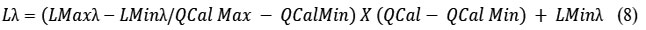 Where, QCAL represents Quantized calibrated pixel value in DN; QCALMIN & QCALMAX denote minimum and maximum quantized calibrated pixel value in DN; LMINh and LMAXh Spectral radiance scaled to QCal Max Ns QCal Min.