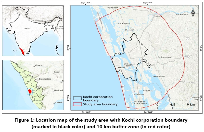 ![]() | Figure 1: Location map of the study area with Kochi corporation boundary (marked in black color) and 10 km buffer zone (in red color).