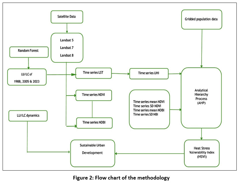 The most reliable estimate of the human - induced increase in temperatures from 1850-1900 to 2010-2019 is approximately 1.1°C. These changes encompass heightened occurrences of drought, floods and other extreme natural phenomenoa.8 Understanding the evolution of urbanization pattern and LULC changes remain a crucial component to be considered in sustainable urban planning and environmental management. Similarly, LST patterns furnish valuable insights into urban microclimates, thereby facilitating an enhanced comprehension of UHI dynamics.9,10