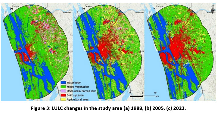 ![]() | Figure 3: LULC changes in the study area (a) 1988, (b) 2005, (c) 2023.
