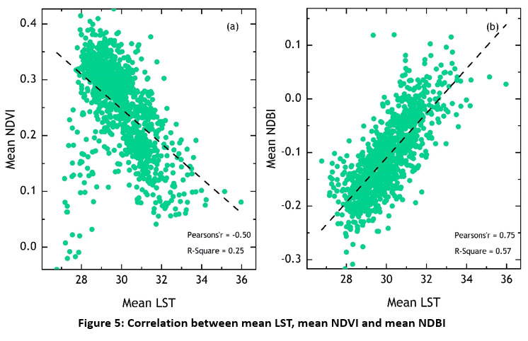 This conversion of vegetative cover into urbanized zones has led to a notable rise in temperature. The investigation reveals a direct correlation between LST and built-up areas, aligning with findings from a study conducted in urban regions of Italy by Morabito. 45 Impervious surfaces exert a considerable positive influence on LST. The percentage of imperviousness emerges as the most reliable predictor of LST, corroborating the outcomes of Zhou.44 These findings are consistent with earlier research by Yuan.45 Conversely, vegetation exhibits a substantial negative impact on LST, mirroring observations made in the colder Twin Cities Metropolitan Area of Minnesota,45 as well as the hotter and drier Phoenix metropolitan region of Arizona.46,47 In Kochi, the intensity of the Urban Heat Island was moderate to high in both the winter and summer, and it is thought to be positively correlated with urbanization.52 The correlation coefficient (r or R) serves as a measure of the degree of association between two variables - independent and dependent variables.50 The study concludes that spectral indices such as NDBI and NDVI are indeed linked to LST.40,41