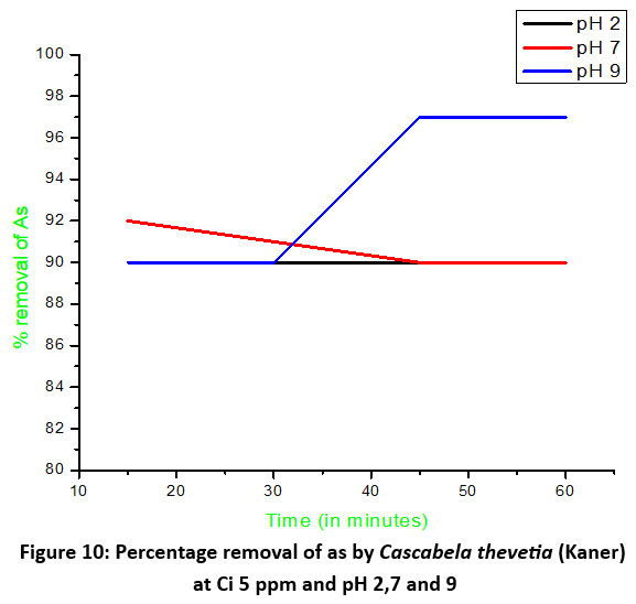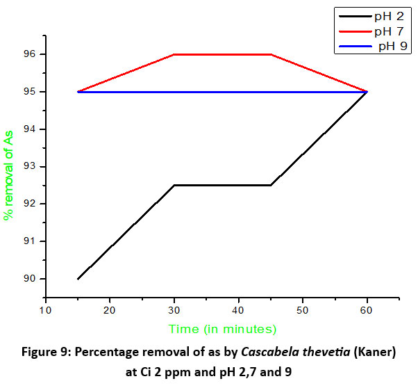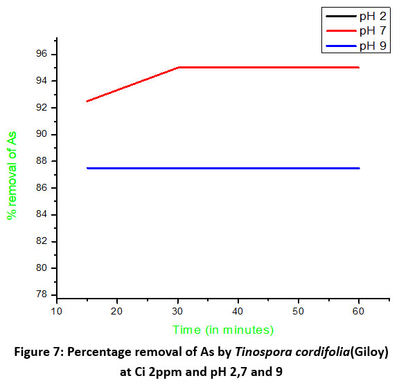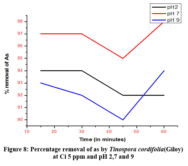 The maximum removal of arsenic with T. cordifolia takes place at a pH of 7 with initial concentrations of 2 ppm and 5 ppm arsenic solution as shown in Table 1. The maximum percentage removal for 2 ppm As(III) at pH 2 is 87.5% whereas at pH 7 it is 95%. For an initial concentration of 5 ppm, the maximum percentage removal is 98% at pH 7.