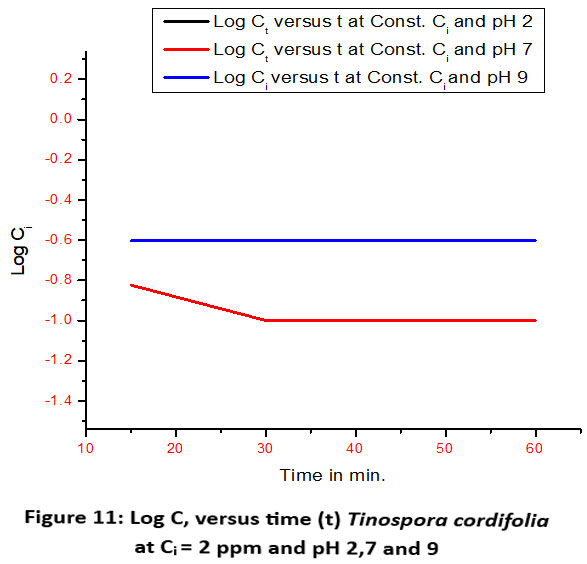 Figure 11: Log Ci versus time (t) Tinospora cordifolia at Ci = 2 ppm and pH 2,7 and 9