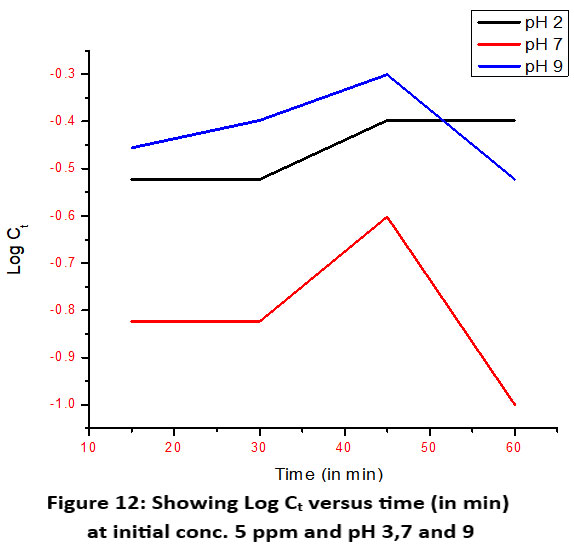 Figure 12: Showing Log Ct versus time (in min) at initial conc. 5 ppm and pH 3,7 and 9