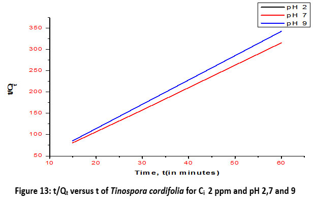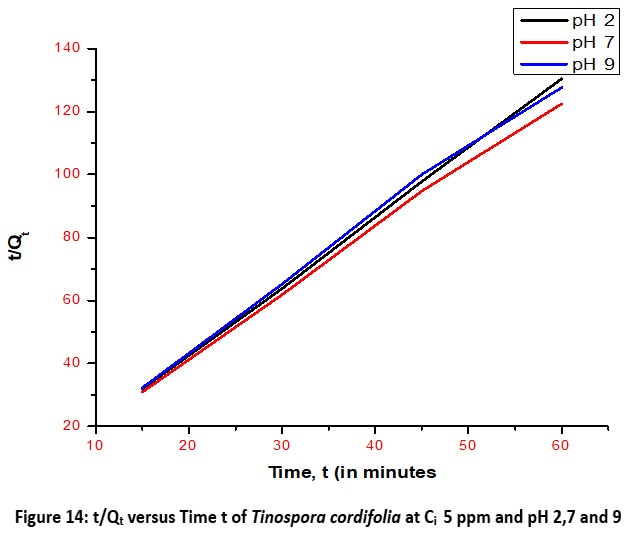 Figure 14: t/Qt versus Time t of Tinospora cordifolia at Ci 5 ppm and pH 2,7 and 9