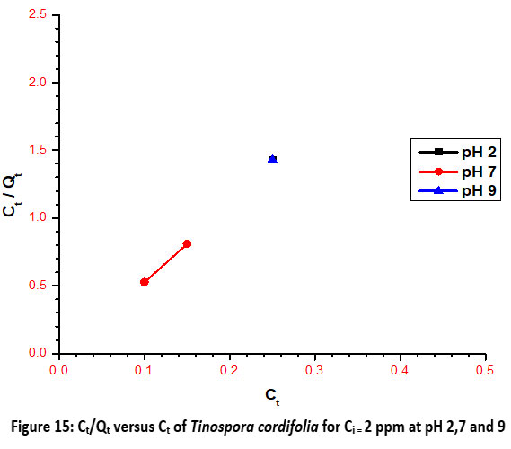Figure 15: Ct/Qt versus Ct of Tinospora cordifolia for Ci = 2 ppm at pH 2,7 and 9