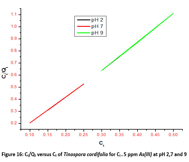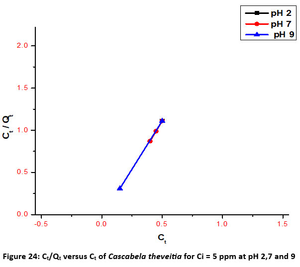 Figure 23 and 24: show the plot of Ct/Qt versus Ct for adsorption of As(III) by C. thevetia for initial concentrations 2 and 5 ppm at pH 2, 7 and 9.