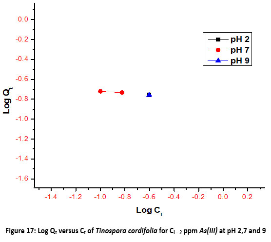 Figure 17: Log Qt versus Ct of Tinospora cordifolia for Ci = 2 ppm As(III) at pH 2,7 and 9