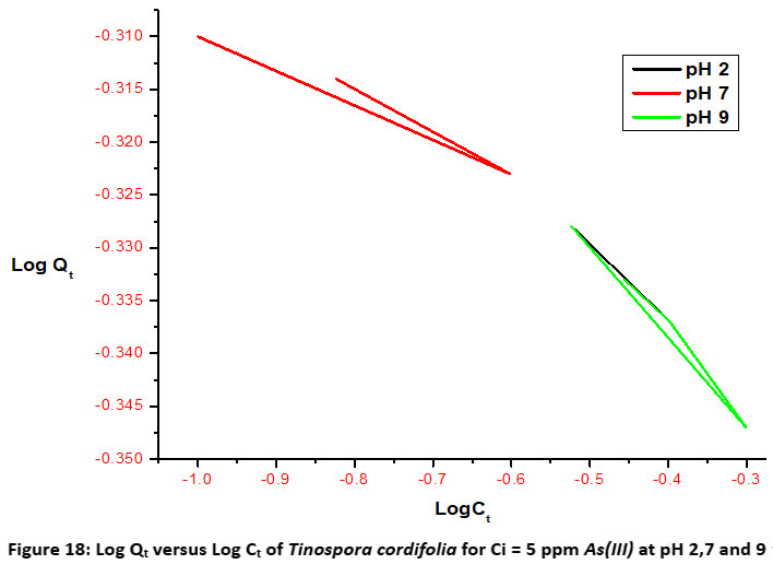 Figure 18: Log Qt versus Log Ct of Tinospora cordifolia for Ci = 5 ppm As(III) at pH 2,7 and 9