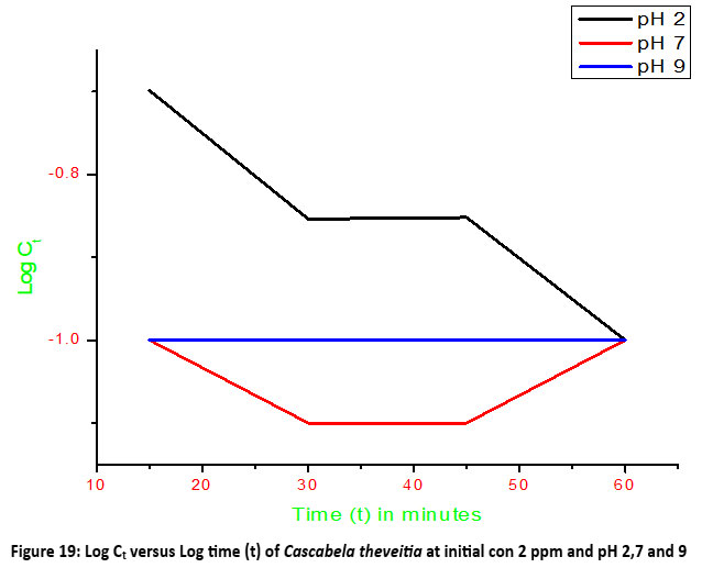 Figure 19: Log Ct versus Log time (t) of Cascabela theveitia at initial con 2 ppm and pH 2,7 and 9