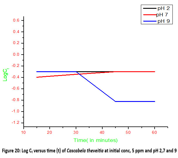 Figure 20: Log Ct versus time (t) of Cascabela theveitia at initial conc, 5 ppm at pH 2,7 and 9