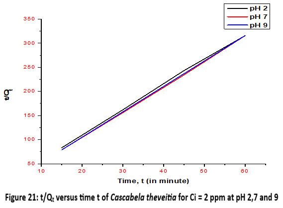 Figure 21: t/Qt versus time t of Cascabela theveitia for Ci = 2 ppm at pH 2,7 and 9