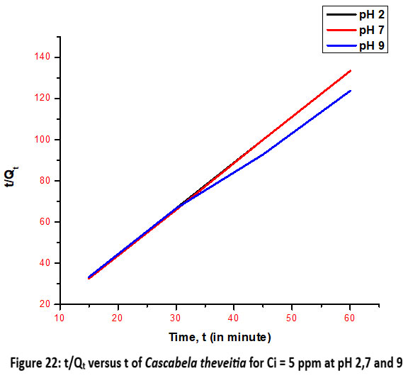 Figures: 21 and 22 show pseudo second order model for adsorption by C. thevetia clearly indicating that this model is the fit for C. thevetia.