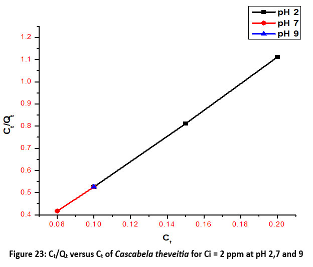 Figure 23: Ct/Qt versus Ct of Cascabela theveitia for Ci = 2 ppm at pH 2,7 and 9