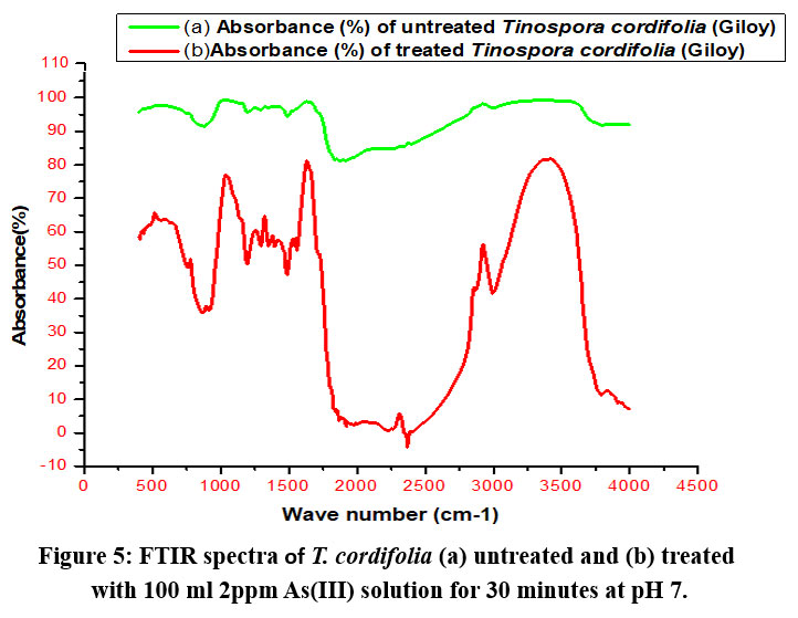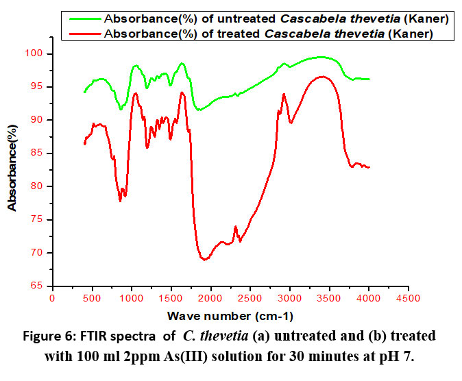 Fourier transmission infrared (FTIR) spectroscopy was done to explore the adsorption of As(III) by T. cordifolia and C. thevetia. The presence of -OH and –COOH groups, and lignin in the plant biomass can be explained as cause of adsorption of As(III) on the surface. The changes in shifts and intensity clearly indicate the adsorption on the surface.