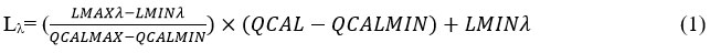 Lh= Spectral Radiance, QCAL= Quantized cali. pixel (DN value), LMAXh= Radi. Max Band to QCALMAX, LMINh= Radi. Min Band to QCALMIN, QCALMAX= Maximum quantized calibrated, QCALMIN= Min. Maxi. quantized calibration.