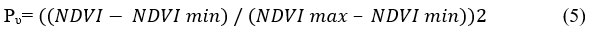 Where, Pv= Vegetation, NDVI= DN value from NDVI, NDVI min = Minimum NDVI, NDVI max = Maximum NDVI.
