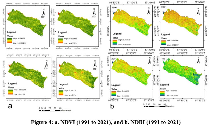![]() | Figure 4: a. NDVI (1991 to 2021), & b. NDBI (1991 to 2021)