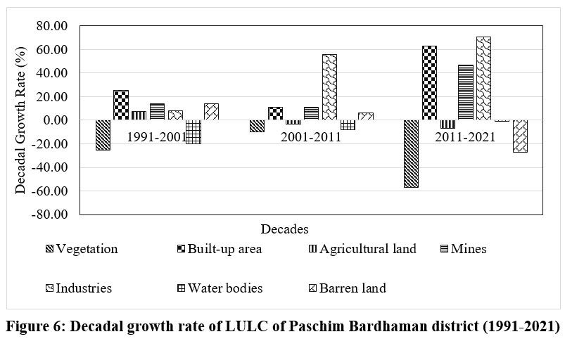 A comprehensive understanding of dynamic changes of land use is necessary to monitor its environmental effect in Paschim Bardhaman district. Major urban centres of the district were developed beside Grand Trunk Road. The establishment of Railway lines, the availability of mineral ore, and the abundance of minerals in the surrounding areas have all contributed significantly to the expansion of IISCO at Burnpur, making Asansol a significant urban hub in the Paschim Bardhaman district. The southwest portion of the study area has seen development of yet another major urban sprawl. Additionally, because of the lower land prices and the desire to avoid the extreme land pressure in the core region, individuals are more inclined to choose the periphery.21,22 Asansol-Durgapur industrial region primarily focuses on these two growth centres.23 Expansions of both cities led towards formation of second metropolis within the West Bengal. Both the centres have already influenced their immediate sub-urban hinterland towards urban transformation.24 According to Census of India report (1971-2011), the urban population increased by 115.15%, and in 2001-2011 increased by about 30%, and the rural population declined by 8.12%. Due to the availability of huge mineral resources, this district emerged as a major industrial hub in eastern India. In a single district, 10378 registered industries are recorded which occupied near about 36 km2 of land.25 After 2001, approximately 70% of new opencast mines are opened, it has enormous impact on air quality, temperature, and agriculture.26,27