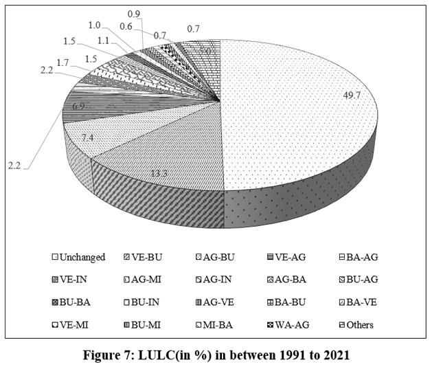 ![]() | Figure 7: LULC(in %) in between 1991 to 2021