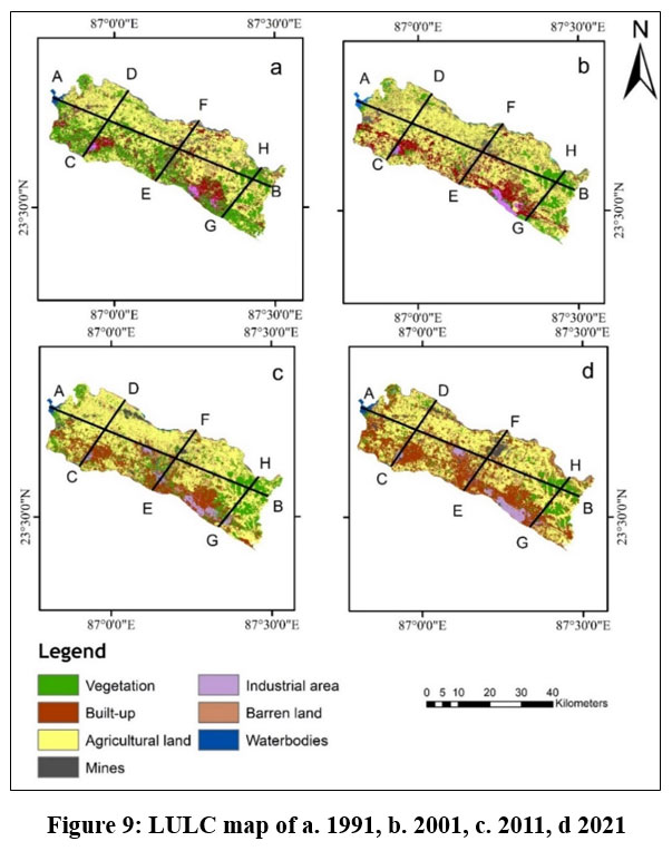 ![]() | Figure 9: LULC map of a. 1991, b. 2001, c. 2011, d 2021