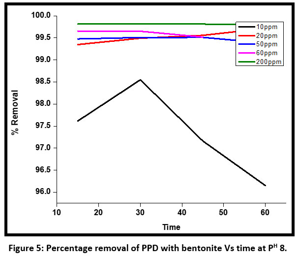 ![]() | Figure 5: Percentage removal of PPD with bentonite Vs time at PH 8 .