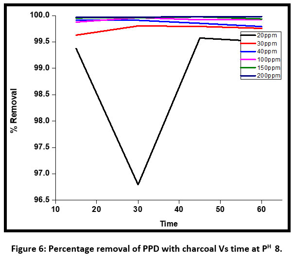 Figure 6 shows the percentage removal of PPD with active charcoal Vs time at pH 8. At this pH the discoloration percentage of dye is 100% complete for initial concentration of 30 ppm, 40 ppm, 100 ppm, 150 ppm, and 200 ppm respectively. Maximum removal of PPD has been observed at pH 8 using active charcoal.