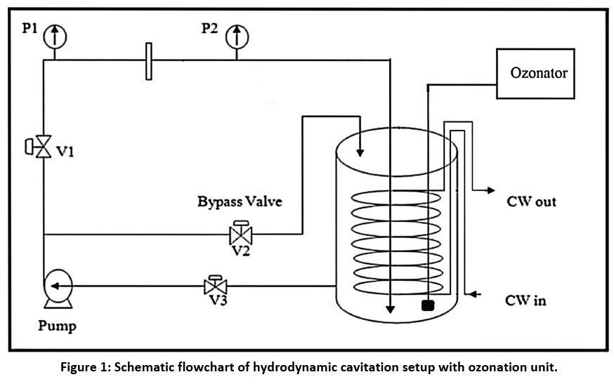![]() | Figure 1: Schematic flowchart of hydrodynamic cavitation setup with ozonation unit.