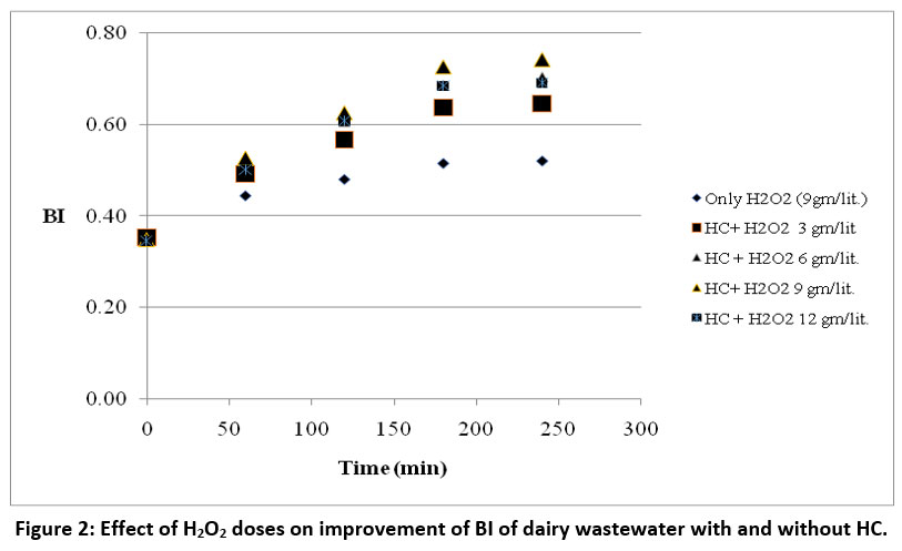 ![]() | Figure 2: Effect of H2O2 doses on improvement of BI of dairy wastewater with and without HC.