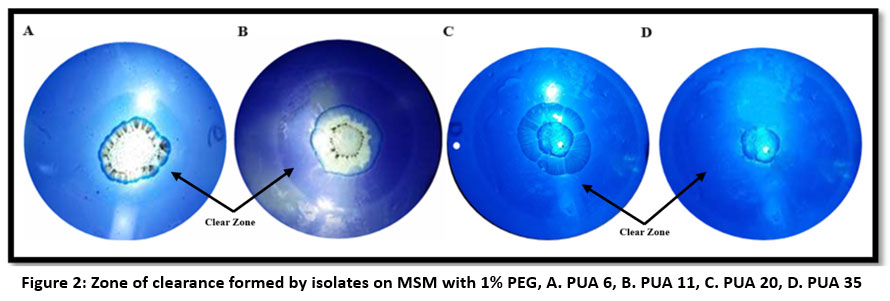 ![]() | Figure 2: Zone of clearance formed by isolates on MSM with 1% PEG, A. PUA 6, B. PUA 11, C. PUA 20, D. PUA 35