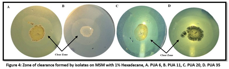 ![]() | Figure 4: Zone of clearance formed by isolates on MSM with 1% Hexadecane, A. PUA 6, B. PUA 11, C. PUA 20, D. PUA 35