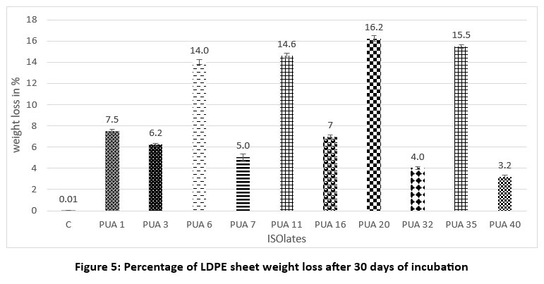 The lab-scale LDPE sheet degradation was confirmed by determination of weight loss after 1 month of incubation time. The weight loss determination is the simplest technique frequently used for the confirmation of LDPE degradation.