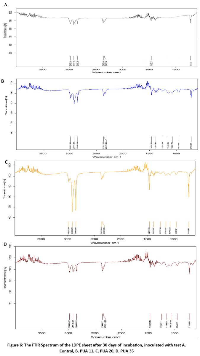 ![]() | Figure 6: The FTIR Spectrum of the LDPE sheet after 30 days of incubation, inoculated with test A. Control, B. PUA 11, C. PUA 20, D. PUA 35