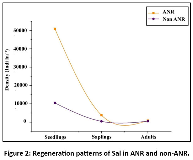 The present study compares the regeneration status of Sal forests under Assisted Natural Regeneration (ANR) and non-ANR conditions in the Kumaun Himalaya, a region where such a comparative analysis has not been conducted previously. Tree stages were classified into three categories based on diameter at breast height (DBH): adults (DBH > 5 cm), saplings (DBH < 5 cm), and seedlings (DBH < 1 cm). The results show that ANR has a hierarchical structure of seedlings > saplings> adults, indicating good regeneration and recruitment. Conversely, non-ANR shows fair regeneration, characterized by seedlings being the most abundant followed by adults, and saplings being the least abundant (seedlings > adults > saplings). The results highlight the importance of ANR practices in promoting Sal regeneration.