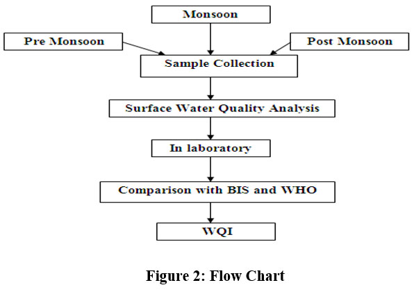 The samples were drawn from the locations by using composite sampling methodology. Samples of surface water were taken throughout the monsoon, postmonsoon, and pre-monsoon seasons. Following extensive cleaning, 84 surface water samples were meticulously gathered in sterile polythene bottles, each of which was appropriately labeled. GPS coordinates were taken at each site to determine precise sampling positions, and after then, these coordinates were used to generate a sampling site map using Arc GIS 10.8. Every collected sample was analyzed in a lab, and the outcomes are compared with BIS and WHO guidelines. Weighted Arithmetic Index Method was used to calculate water’s WQI.12