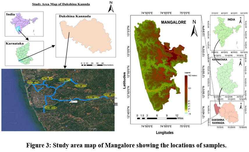 The research area shown in Figure 3 is the seaside area of the DK regionin the Karnataka state of India. It is positioned in between latitudes 12°45' N and 13°7'30" N and longitudes 74°45' E and 75° E. Nethravati and Gurpur are the study area's two principal rivers. We solely took into account the city's Central and Southern regions for our analysis. The quality assessment in this study was limited to Netravati and Gurupura River. The locations of the samples are shown in Table 1 in addition to longitude and latitude data, providing a brief overview of the sample locations.