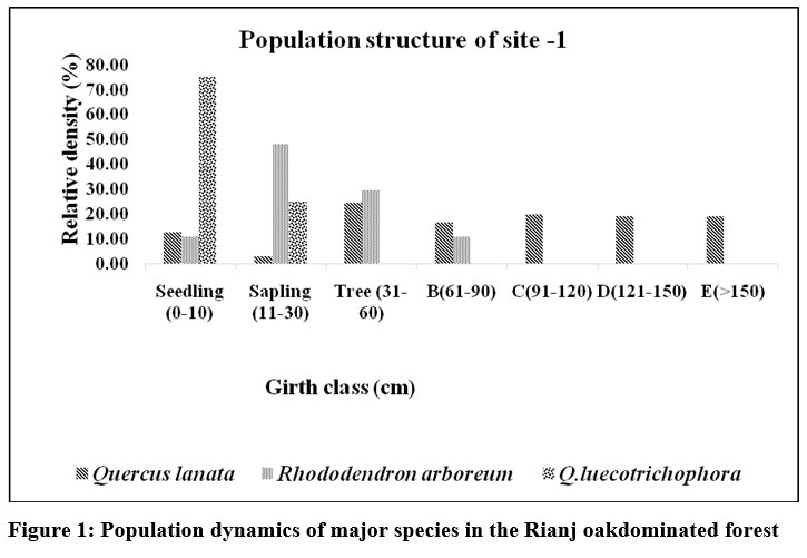 Tree size class distribution is the primary indicator of forest population structure.23,15 The population structure of site 1 and site 2 shows notable contrasts in girth class distribution among various species. In site-1, the relative density of Q. lanata is higher in the seedling (0-10 cm) and sapling (11-30cm) classes. Therefore, density decreases in larger girth classes, suggesting fewer mature individuals. Site 2 show highest relative density is observed in the seedling class (0–10 cm), indicating active recruitment but the conversion of seedling into sapling was poor. The limited representation of higher girth class trees at both sites may be due to factors such as low recruitment rates, high mortality, or disturbances like grazing, logging, or environmental stress. The absence of older trees also indicates that the forests might be in an earlier successional stage, where mature individuals are not yet established. Site 2 shows a more sustainable population structure with consistent presence across various girth classes, whereas site1 appears to depend largely on younger individuals, which might result in challenges in maintaining a stable number of mature individuals. The lack of mature trees in the larger girth classes observed in this study likely reflects the effects of past selective logging or elevated mortality rates caused by anthropogenic disturbances. In addition, climate variability such as irregular rainfall and rising temperature these problems by disrupting the processes of seed development and germination.40