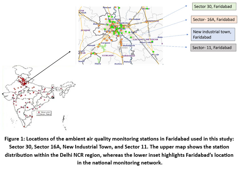 ![]() | Figure 1: Locations of the ambient air quality monitoring stations in Faridabad used in this study: Sector 30, Sector 16A, New Industrial Town, and Sector 11. The upper map shows the station distribution within the Delhi NCR region, whereas the lower inset highlights Faridabad’s location in the national monitoring network.